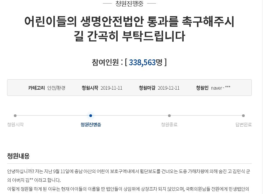 이 외 어린이 5법 등 많은 국민 청원들이 올라와있지만 시간이 지날수록 언론의 관심이나 국회의원의 관심, 국가의 관심이 줄어 청원을 하여도 참여인원 20만명이 넘지 않는다면 답변도 받을 수 없는 상황인데요,
