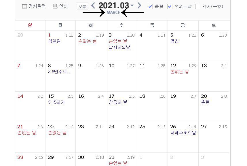 2021년 3월 손 없는 날 : 3월 2일, 3일, 12일, 21일, 22일