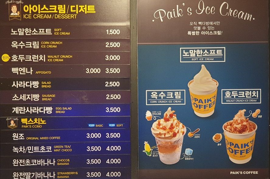 노말한 소프트 아이스크림 가격은 1,500원 옥수크림 아이스크림은 2,500원 호두 크런치 아이스크림 3,000원, 빽앤나라는 것은 아포가토를 빽엔나라고 합니다. 빽다방 소프트 아이스크림이랑, 아이스크림 종류도 맛 있으니 추천 메뉴 입니다.