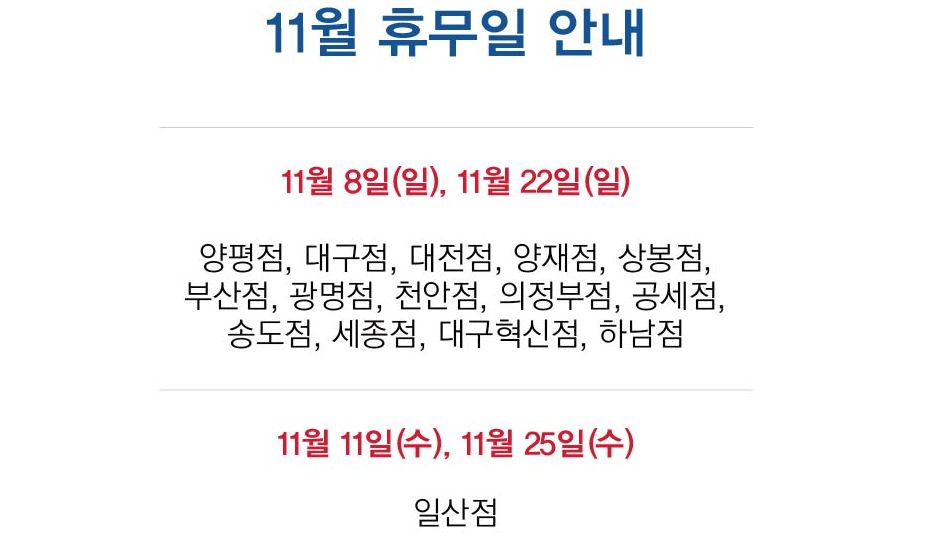 코스트코 양재점 11월 휴무일은 8일과 22일 일요일이니 11월 코스트코 양재점 방문 예정이라면 휴무일 확인 후 방문하실 때 도움이 되었으면 좋겠습니다.