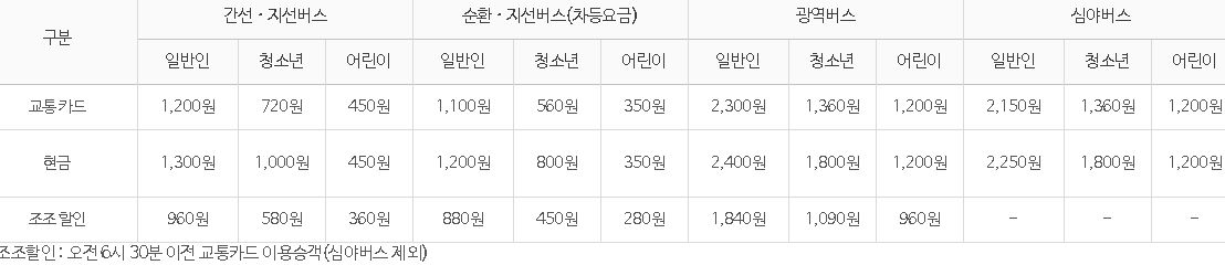 서울 버스요금 간선, 지선버스 이용 시 현금 청소년 1,000원, 어린이 450원, 일반인 1,300원 입니다.