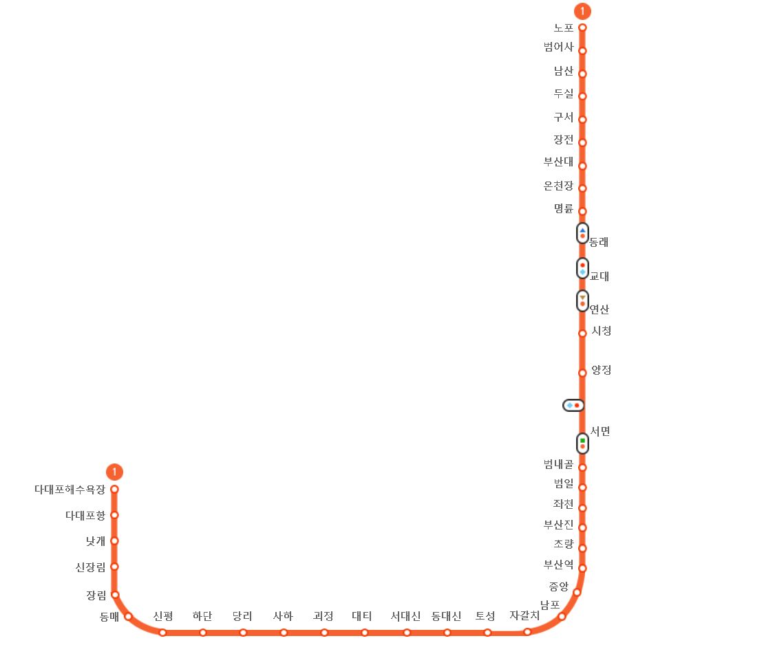 노포역 - 범어사 - 남산역 - 두실역 - 구서역 - 장전역 - 부산대역 - 온천장 - 명륜역 - 동래역 - 교대역 - 연산역 - 시청역 - 양정역 - 부전역 - 서면역 - 범내골역- 범일역 - 좌천역 - 부산진역 - 초량역 - 부산역 - 중앙역 - 남포동역 - 자갈치역 - 토성역 - 동대신역 - 서대신역 - 대티역 - 괴정역 - 사하역 - 당리 - 하단역 - 신평역 - 동매역 - 장림역 - 신장림역 - 낫개역 - 다대포항역 - 다대포해수욕장역 까지 있습니다.