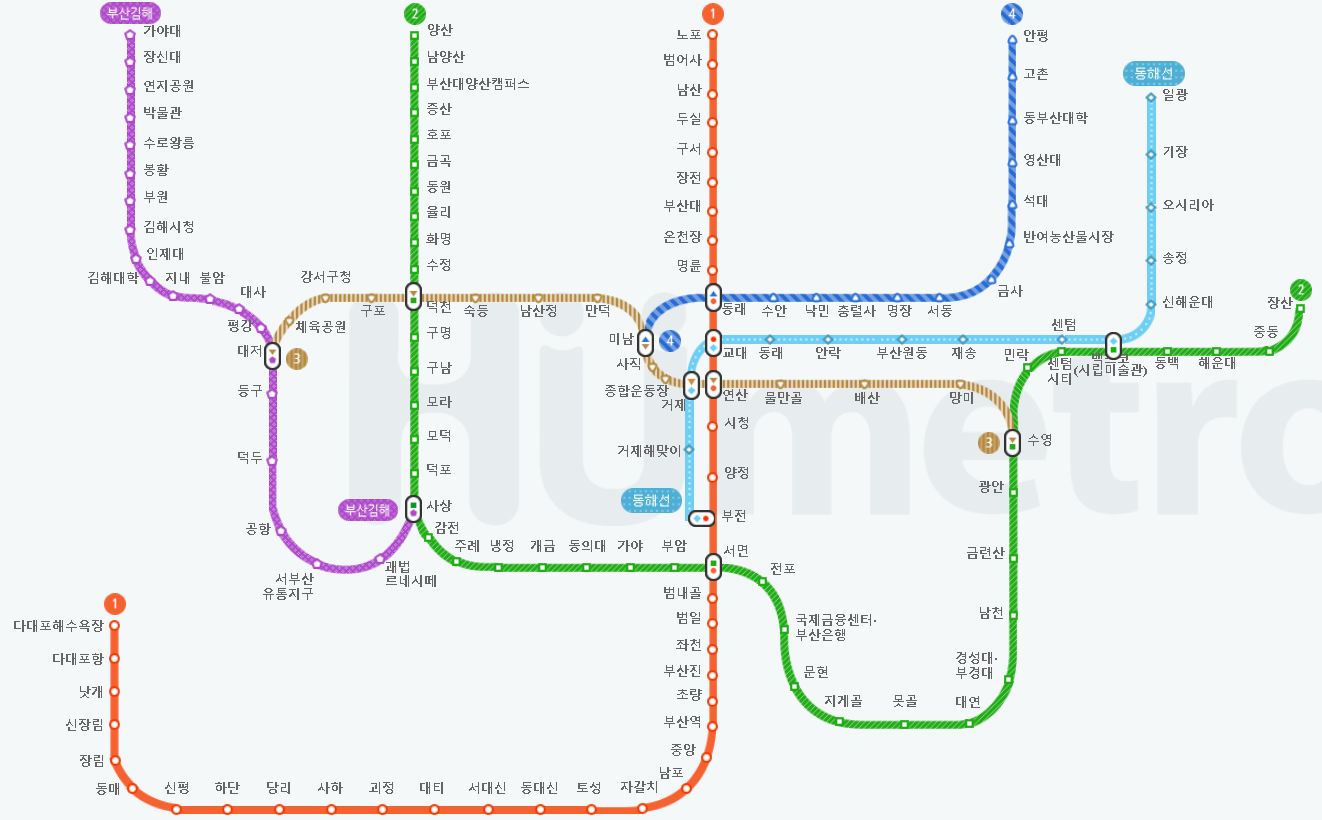부산 지하철 노선도는 1호선부터 2호선, 3호선, 4호선, 동해선, 부산김해 경전철까지 있습니다.