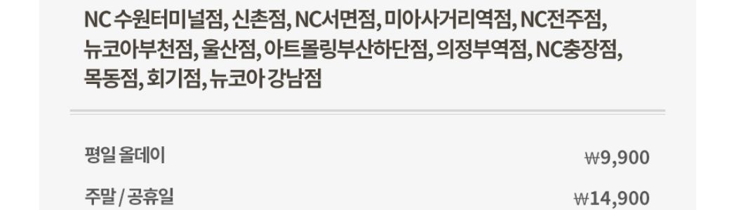 그 외 피자몰 NC 수원터미널점, 신촌점, 서면점, 미아사거리역점, 전주점, 뉴코아부천점, 울산점, 아트몰링 부산하단점, 의정부역점, 충장점, 목동점, 회기점, 뉴코아 강남점 피자몰 뷔페 가격은 평일 올데이 9,900원 입니다.
