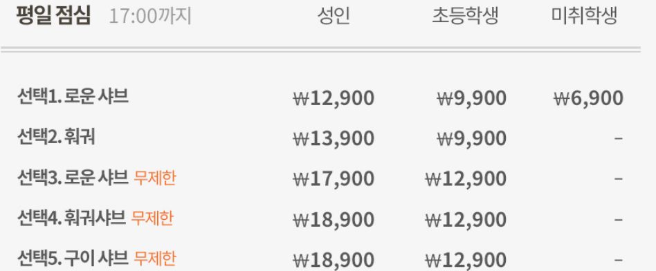 로운샤브샤브 가격은 무제한, 훠궈, 구이 메뉴 등 5가지로 나뉜답니다.