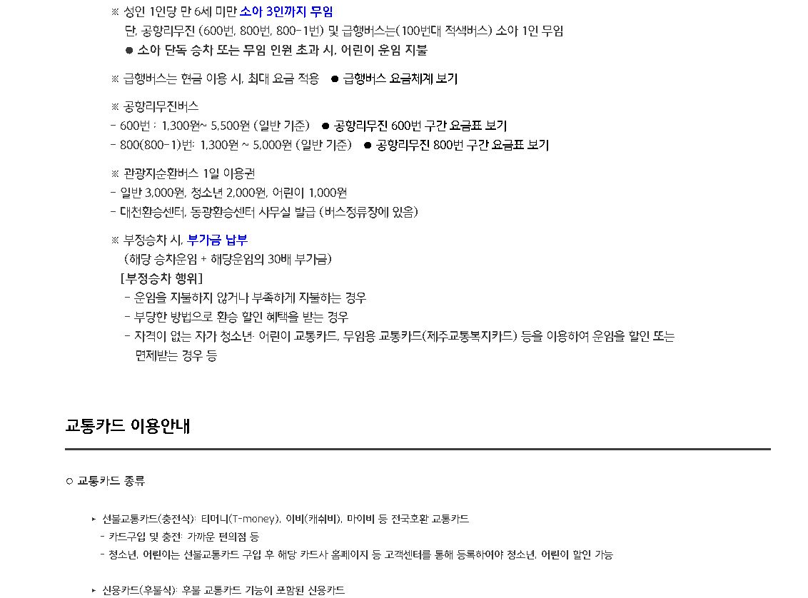 제주도 시내버스 요금에는 성인 1인당 6세미만 소아 3일까지 무임으로 승차 가능하며, 공항리무진 600번, 800번, 800-1번 및 급행버스 100번대 적색버스는 성일1인당 만 6세 미만 소아 1인까지만 무임 승차 가능합니다.