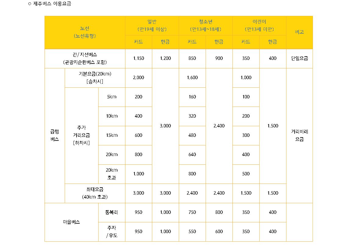 제주도 시내버스 요금에는 성인 1인당 6세미만 소아 3일까지 무임으로 승차 가능하며, 공항리무진 600번, 800번, 800-1번 및 급행버스 100번대 적색버스는 성일1인당 만 6세 미만 소아 1인까지만 무임 승차 가능합니다.