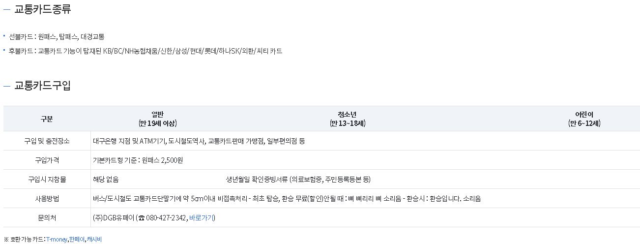 대구 시내버스 이용 가능한 교통카드 종류는, 원패스, 탑패스, 대경교통 선불카드가 있으며, 교통카드 기능이 탑재된 후불 교통카드(신용카드) 도 교통카드로 이용이 가능합니다. 대구 시내버스 호환 가능한 교통카드는 티머니, 한페이, 캐시비가 있습니다.