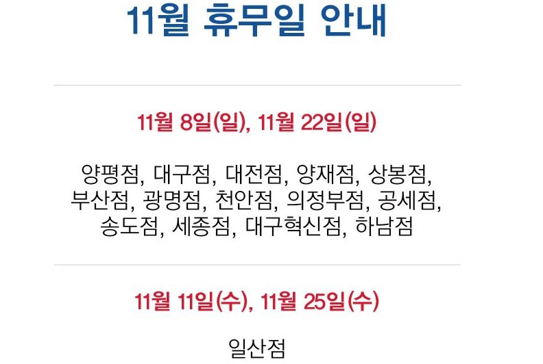 11월 대구 코스트코 휴무일은 11월 8일과 11월 22일이니 코스트코 대구점 11월 방문 예정이라면 휴무일과 영업시간을 확인하셔서 방문시에 도움이 되었으면 좋겠습니다.