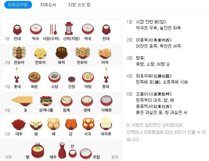 1열 좌반우갱으로 밥은 왼쪽에 오른쪽에는 국이 가도록 놓으며, 2열은 어동육서 어찬은 동쪽 육찬은 서쪽, 3열 탕류는 육탕, 소탕, 어탕 순으로 놓으며, 4열 좌포우혜로 왼쪽에 포, 오른쪽에 식혜, 5열에는 조율이시 왼쪽부터 대추, 밤, 배 순으로 놓으며 홍동백서라고도 하여 붉은 과일은 동쪽 흰과일은 서쪽으로 놓는다고 합니다.