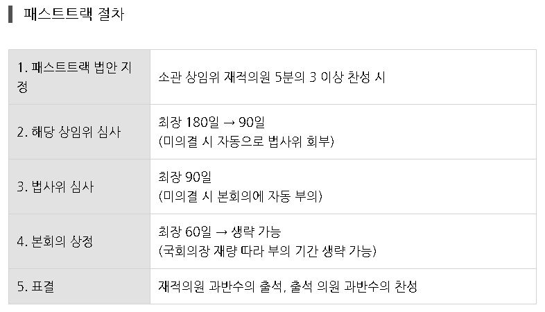 패스트 트랙이란 국회에서 중요성과 긴급성이 있는 특별한 안건을 신속하게 처리하도록 한 법적 절차이며, 사안이 긴급하고 중요한데 국회에서 통과가 지연될 경우 법안이 신속하게 처리될 수 있도록 국회법에서 상임위원회와 본회의의 처리 절차를 규정하고 있다고 합니다.