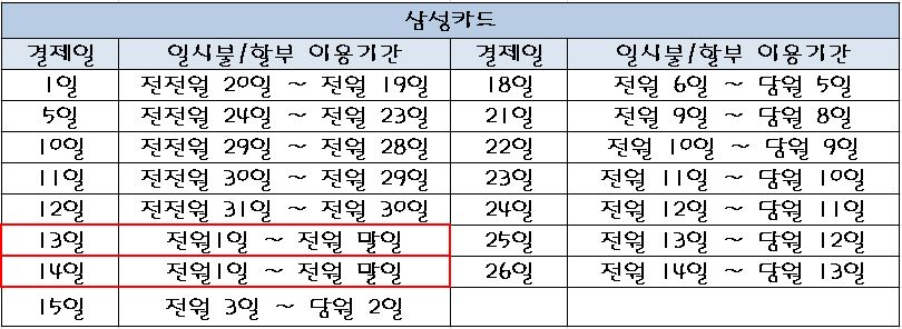 삼성카드 결제일별 사용기간은 위 표와 같으며, 삼성카드에서 가장 알기 쉬운 결제일은 바로 13일과 14일 이더라구요.