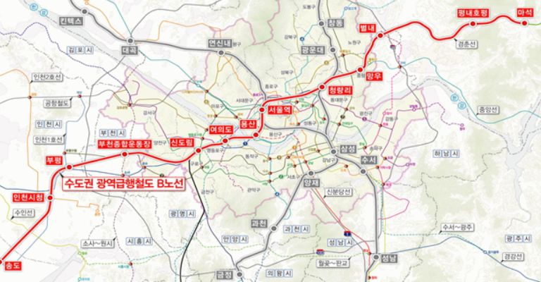 GTX B 노선은 경기도 남양주시 화도읍에서 부터 진행되며 운행 노선은 마석역 - 평내호평역 - 별내역 - 망우역 - 청량리역 - 서울역 - 용산역 - 여의도역 - 신도림역 - 부천종합운동장역 - 부평역 - 인천시청역 - 송도역 등 13개의 노선도로 계획되어 있습니다.