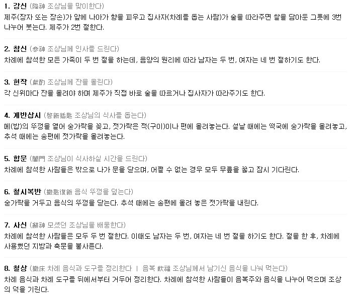 차례 지내는 순서는 강신 - 참신 - 헌작 - 계반삽시 - 합문 - 철시복반 - 사신 - 철상 입니다.