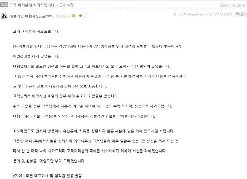 곧 있을 명절 설날에도 필리핀 여행 계획을 하신분들이 많은데, 필리핀 현지 한인 여행사 에브리필이라는 곳이 경영 악화에 노력을 다했으나 부득이하게 폐업 결정을 하게 되었다고 합니다.