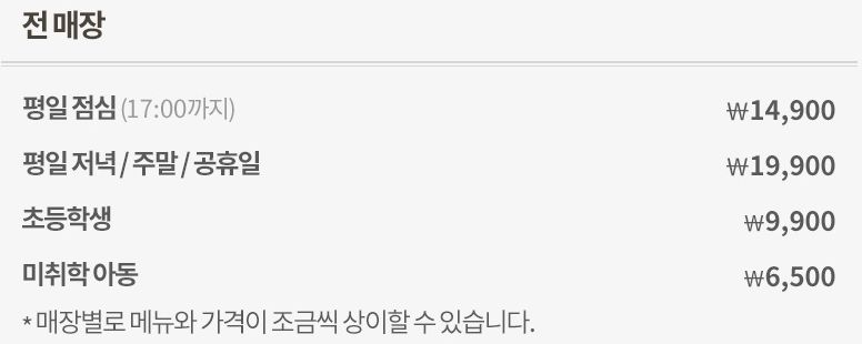 수사 스시 뷔페 가격은 평일 점심 5시까지 14,900원 평일 저녁 주말 공휴일은 19,900원이며, 수사 스시 뷔페 초등학생 가격은 9,900원 미취학 아동 가격은 6,500원입니다.
