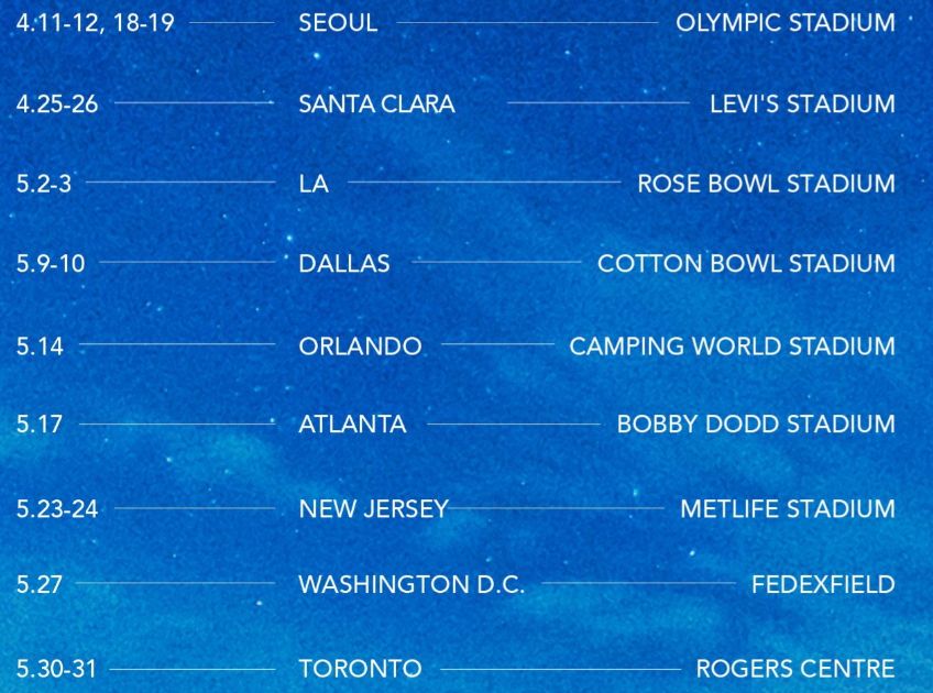 오는 4월11일, 12일, 18일, 19일에는 서울 잠실 올림픽 주경기장에서 방탄소년단 콘서트를 시작으로 17개의 도시 37회의 콘서트가 진행되며, 6월13일, 14일 공연은 일자는 확정이지만 정확한 장소가 공개되지 않아 궁금증이 더해지네요.